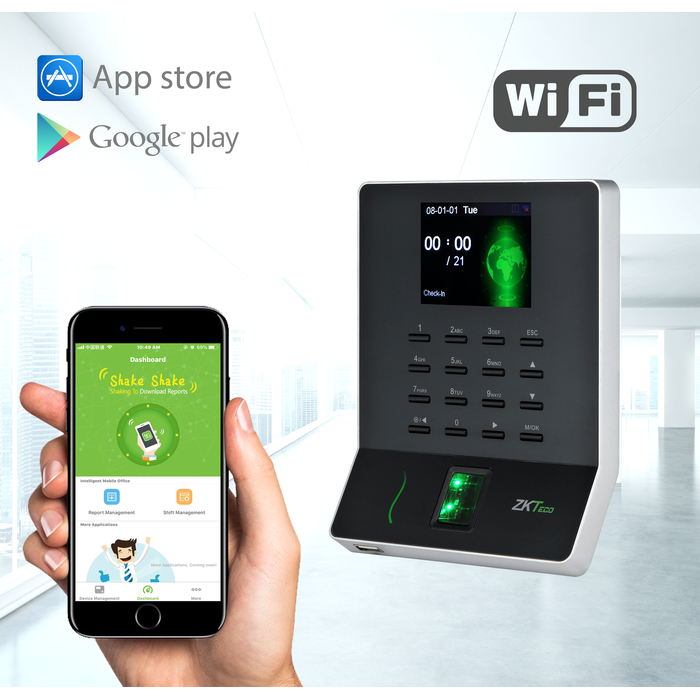 Satu-satunya Mesin Absensi Wifi di Indonesia menggunakan aplikasi Android dan IOS. Aplikasi : TA Assistant Wi-Fi, USB client & host Stable operation under strong light source Infrared auto-turning on function to save power Quick recognition of dry, wet and rough fingers Time Cube Cloud Solution Mobile phone APP TA Assistant download report and shift Management Build-in SSR Excel software, Shift and Report management Fingerprint Capacity 1000 Finger Algorithm ZKFinger VX10.0 Record Capacity 50,000 Display 2.8-inch TFT Screen Communication Wi-Fi , USB-Host, USB-Client Standard Functions SSR, DST, Scheduled-bell, Self-Service Query, Automatic Status Switch, T9 Input 9 digit user ID Optional Functions TA Assistant APP Time Cube Cloud Solution Power Supply DC 5V 0.8A Operating Temp 0 C- 45 C Operating Humidity 20%-80% Dimension 165 x 133 x 21 mm GARANSI PRODUK 1 TAHUN.